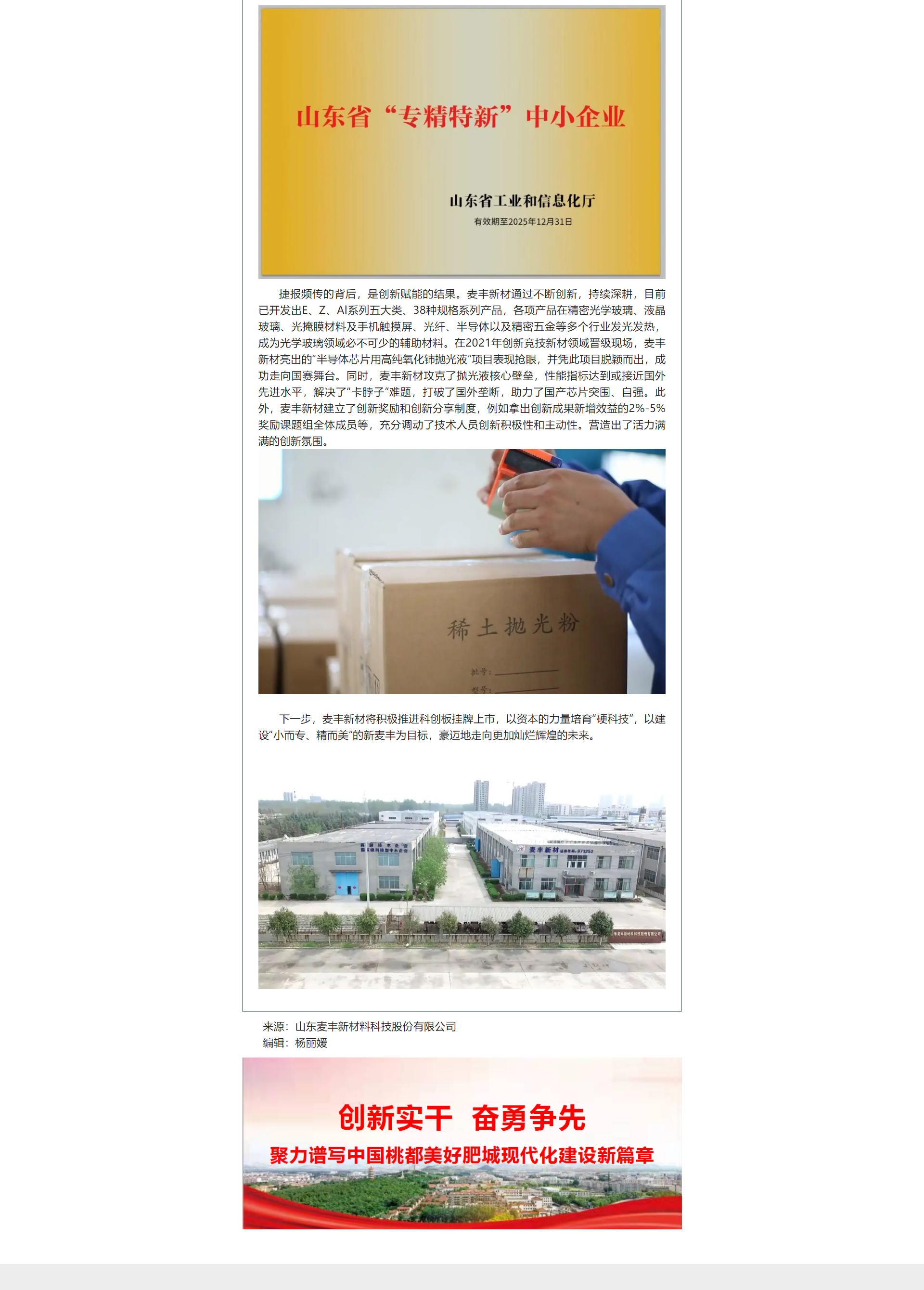 肥城高新公眾號刊發(fā)《山東麥豐新材料科技股份有限公司"瞪羚企業(yè)"培育“硬科技”,建設(shè)“小而專、精而美”,激發(fā)高質(zhì)量發(fā)展新動能》文章