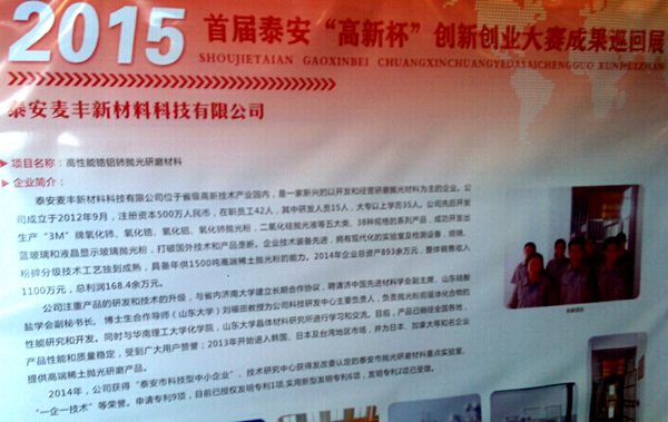 2015年10月30日上午,我公司參加首屆泰安“高新杯”創(chuàng)新創(chuàng)業(yè)大賽成果巡回展,為高新區(qū)及各駐泰高校展示大賽獲獎科技成果。我公司“高性能鋯鋁鈰拋光研磨材料”項(xiàng)目榮獲企業(yè)組三等獎。